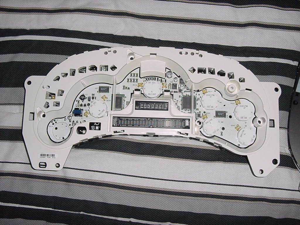 Here are all the parts you should have. From left to right, top to bottom: white housing, clear plastic piece, gauge panel sitting on the rear cover, needles, gauge overlay, and front cover.