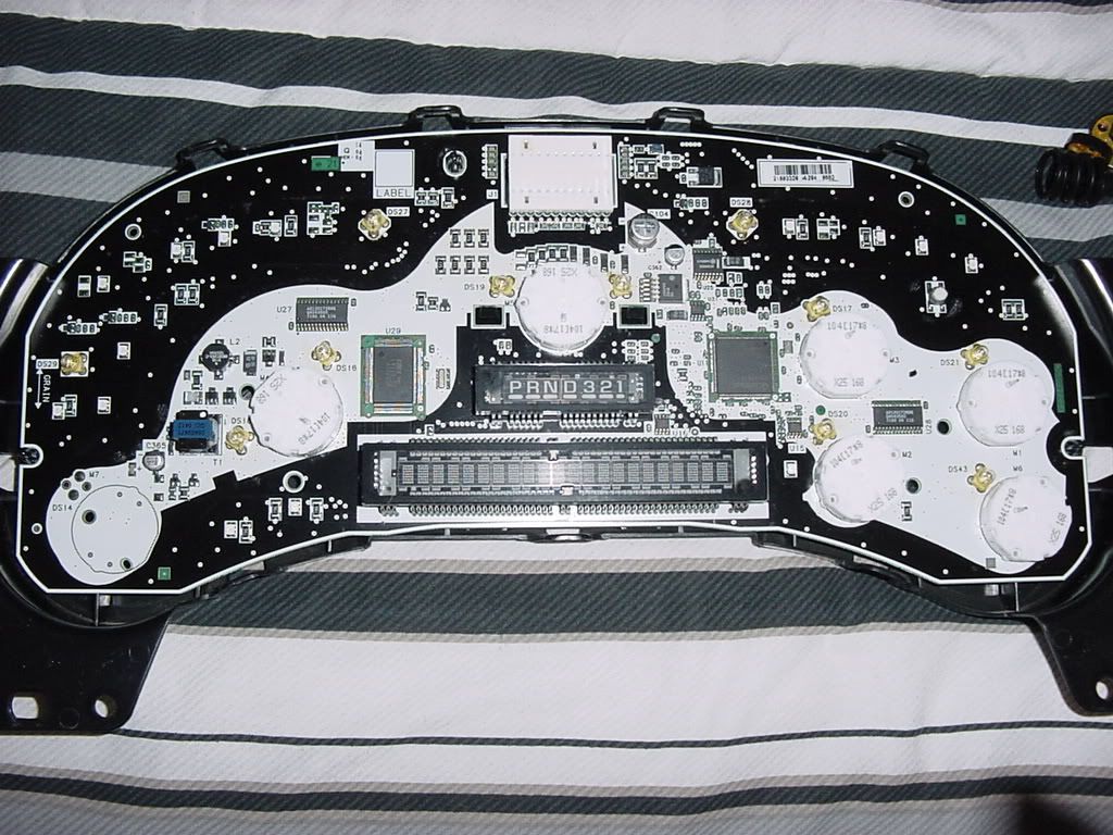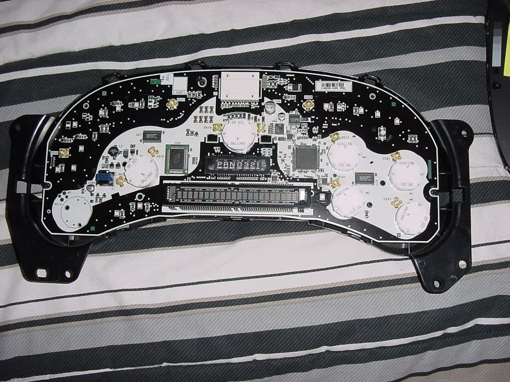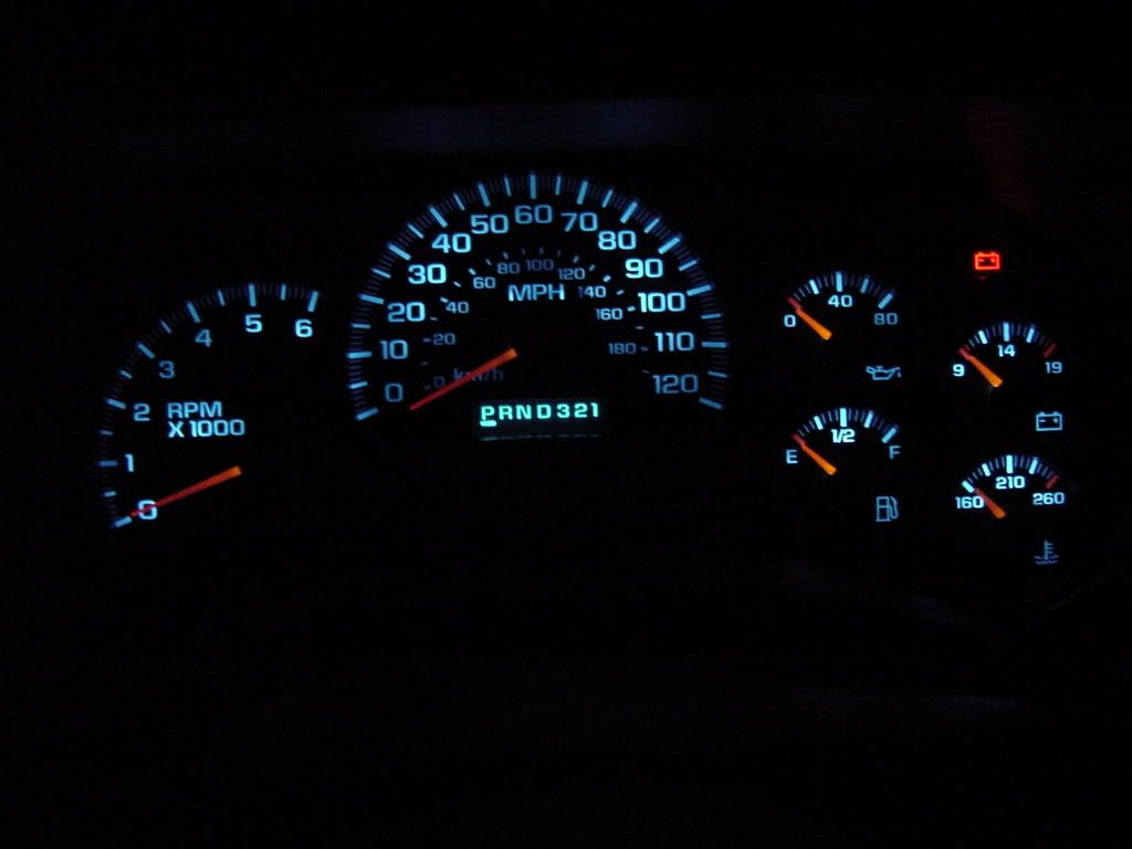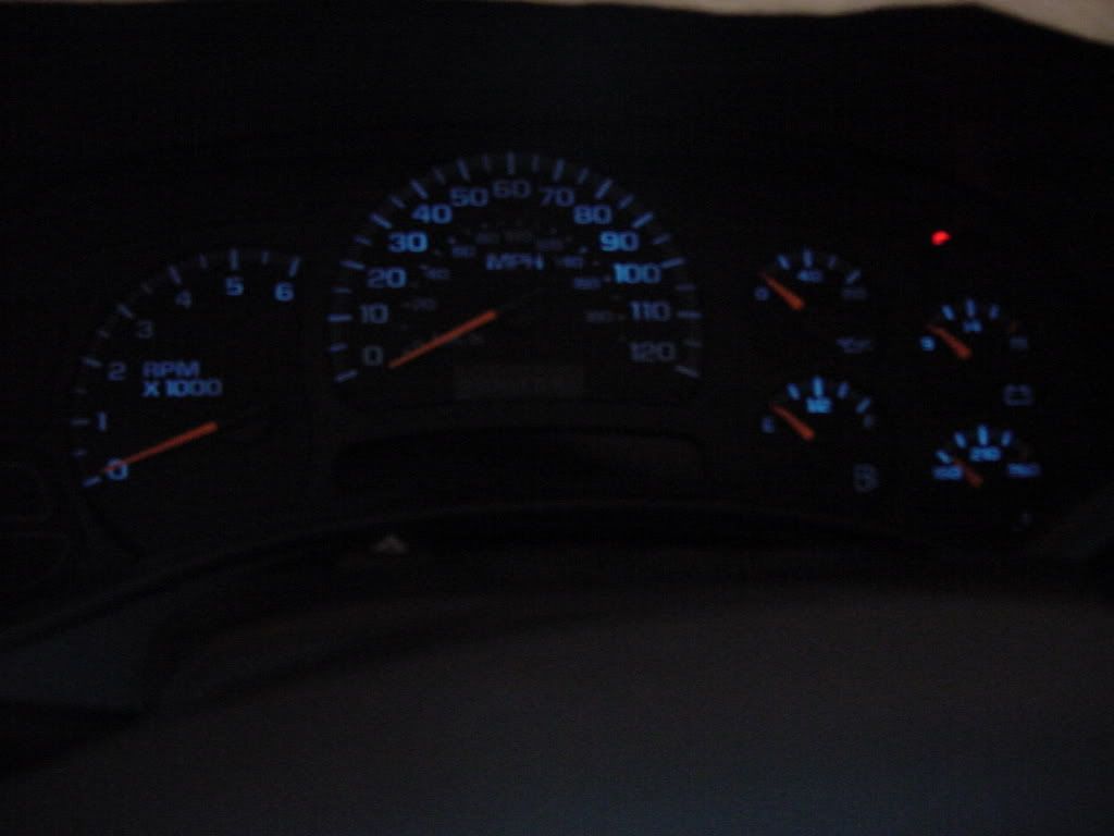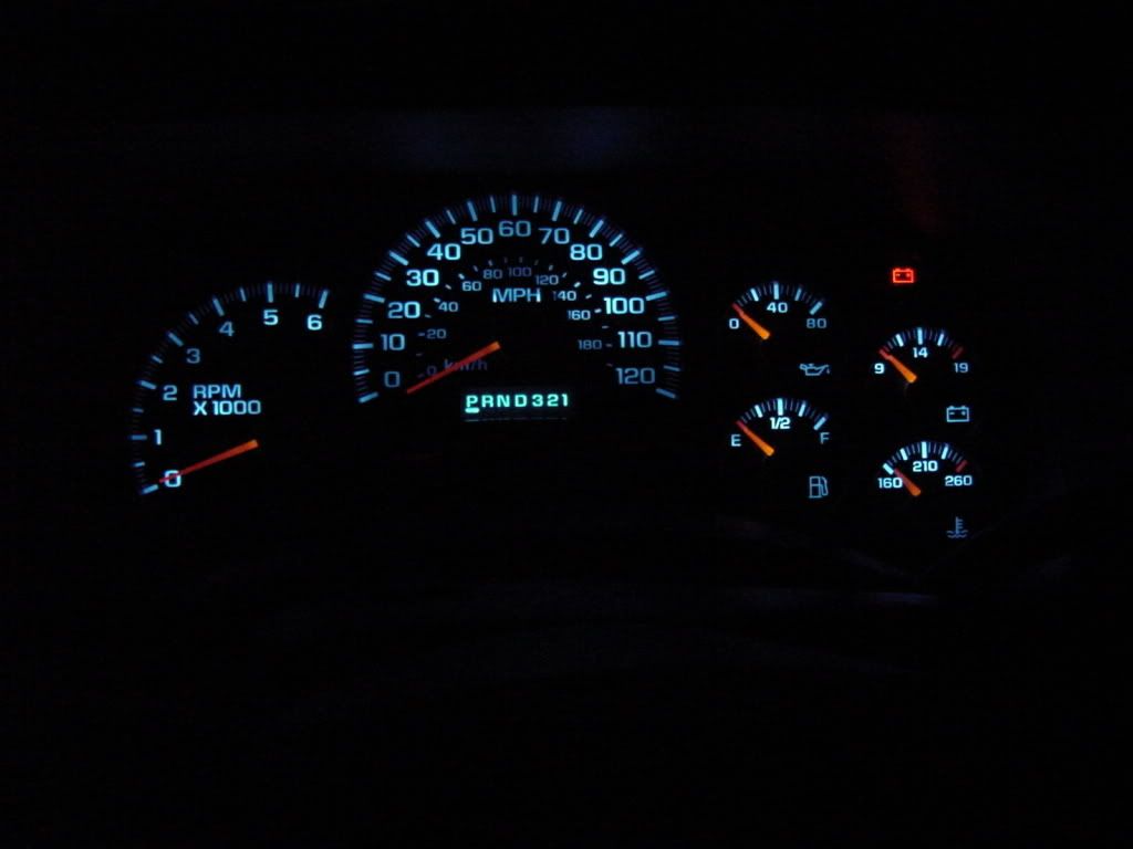 All you have to do is de-solder the factory lights and solder in the LEDs. I am still waiting on parts from superbrightLEDs.com so I will update when I have my parts. After you finish soldering the lights you may want to test the cluster before you install it in the truck. Just assemble the white housing to the back cover so you don't drop the cluster when plugging it in. Plug it into the truck to make sure it works. If it does go reassemble the rest of the cluster making sure the gauge motors are turned to the left still. Lay the gauge overlay on the clear plastic(don't forget the info button!) and make sure its locked onto the little keepers. Line the needles up with the pencil marks and erase them. Snap the front cover on and reinstall in the truck.