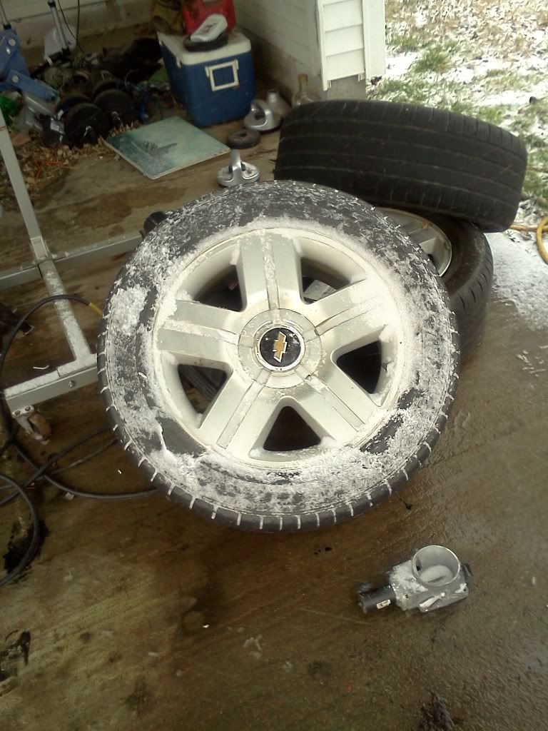 Sellin my 20s for 400 bucks OBO they came stock on an 08 silvy plan on getting rubber I would say rims only but im not pulling the rubber off I still drive on em but I run tires way down unlike most 2 tires have good tread but 1 has a slow leak im sure a plug or patch would fix it. Heres the pics been snowing here. And I took the pics with my phone, buyer pays shipping or I can meet you half way