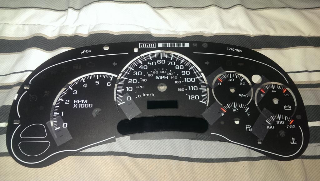 Factory Gauge overlay. The turn signals and the cruise control have been cleared for LED swap. $10 + shipping